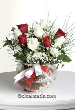 Sevginizi en güzel �ekilde dile getirecek e�siz bir aranjman... Akvaryum cam vazo içerisinde cipso ve ye�illiklerle süslenmi� beyaz ve k�rm�z� güllerden olu�an aranjman, a�k�n�z� bitanenizin kula��na f�s�ldayacak.