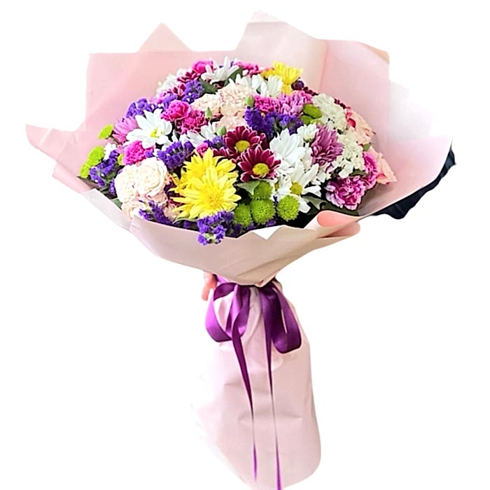 cyndsay.info'un özel tasar�m "Kar���k Papatya Buketi" ile sevdiklerinize bahar�n tüm enerjisini ve renklerin co�kusunu bir arada sunun! Bu göz kama�t�r�c� aranjman, capcanl� sar�, saf beyaz, enerjik mor ve pembenin farkl� tonlar�ndaki krizantem (papatya türleri), renkli karanfiller ve tamamlay�c� ye�illiklerle özenle harmanlanm��t�r. Bebek pembesi tonlar�ndaki ��k ambalaj� ve mor kurdele detay�yla tamamlanan bu buket, her bak��ta pozitif enerji ve mutluluk f�s�ldar. Bu çiçeklerin ahengi, dostlu�u, ne�eyi, kutlamay� ve içtenli�i sembolize eder, tam bir görsel ve duygusal �ölendir.