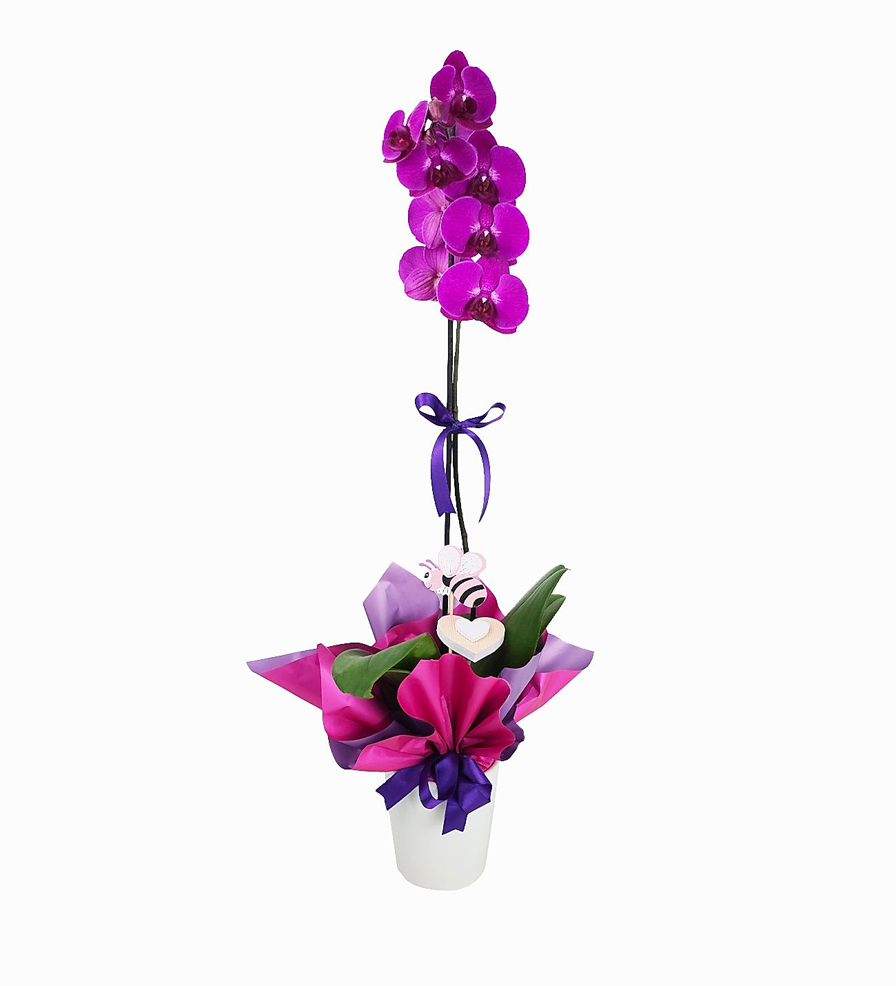 cyndsay.info'un özenle seçti�i "Tek Dal Fu�ya Orkide", büyüleyici fu�ya rengi çiçekleriyle her bak��ta ne�e ve enerji saçan e�siz bir bitkidir. Tek bir sa�l�kl� dal�nda açan gösteri�li çiçekleriyle bu orkide, modern beyaz saks�s� ve mor ile fu�ya tonlar�nda ��k ambalaj�yla sunulmaktad�r. Ürünü daha da cazip k�lan, uyumlu mor kurdeleler ve sevimli ar� biblosu ile kalpli kelebek figürü gibi dü�ünülmü� detaylard�r. Fu�ya orkide, zenginlik, lüks, tutku ve ne�eyi simgeler; bu da onu her türlü kutlama ve tebrik için ideal bir hediye yapar.